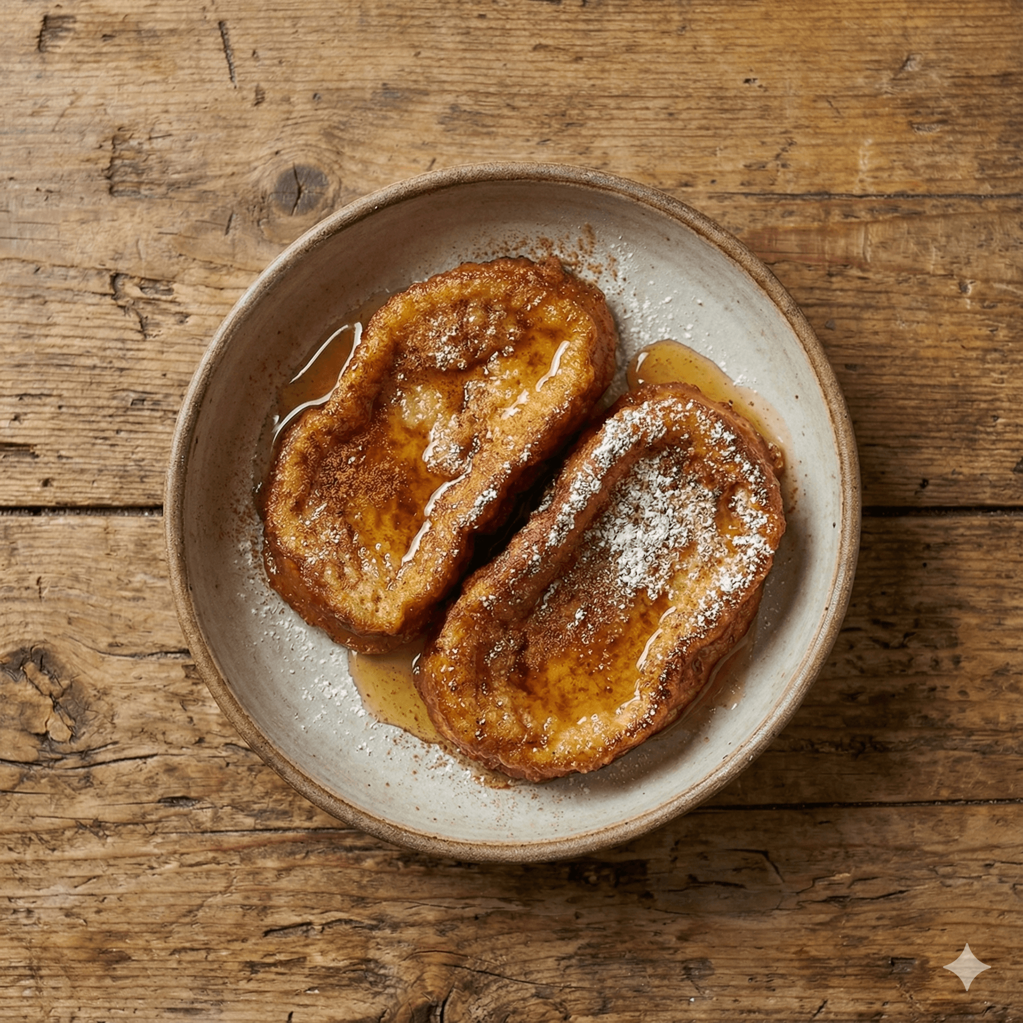 Pan de brioche empapado en leche infusionada con canela y limón, frita al momento y bañada en miel de la sierra o almíbar de vino dulce.