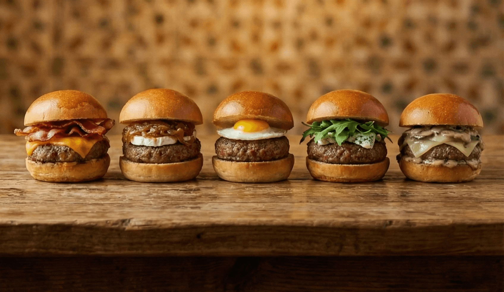 Nuestra burger más castiza. Carne de buey, queso havarti fundido y un huevo de codorniz frito encima con la yema líquida, listo para romper. Servida en pan brioche tostado.